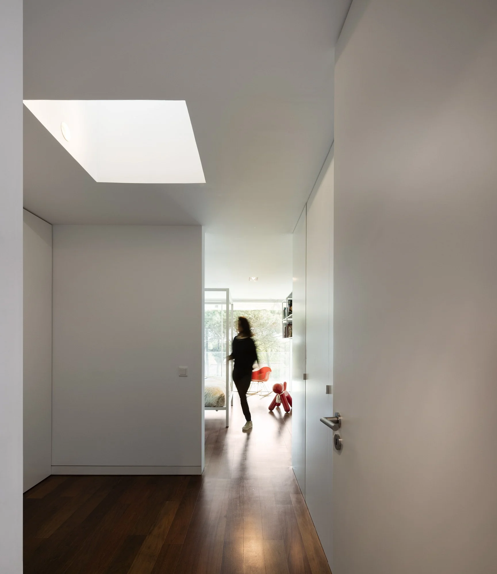 The intersection of the two units, disposed in perpendicular fashion one above the other, serves to dilute and dematerialise the construction – the roof of the lower volume merges with the garden, resulting in an increase in the accessible green areas. The relation between the house and the garden was emphasised, whilst the privacy of the spaces was ensured with a blind façade to the north, privileging the interior of the plot of land in close communication with the construction. The main access to the house is one level above the ground floor, and it articulates the house’s social areas. Here, the focus was on constantly redefining the interior spaces by creating interconnecting permeable, versatile compartments.